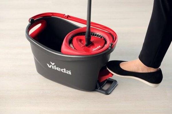 Het schoonmaaksysteem EasyWring & Clean Turbo van Vileda bestaat uit een mop, een steel en een pedaalemmer. De set is gemaakt om verschillende soorten vloeren effectief en moeiteloos schoon te maken. Door de pedaal in de emmer hoef je amper kracht te zetten en niet te bukken om de mop goed uit te wringen. Daarnaast bevat de bijgeleverde emmer een schenktuit en een handvat in de lengterichting om de emmer moeiteloos te kunnen legen. Door de maataanduiding in de emmer doe je nooit teveel water in de emmer.